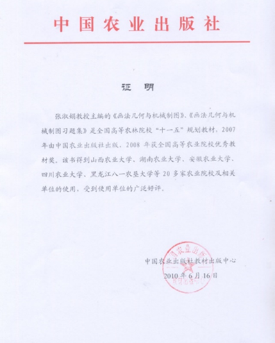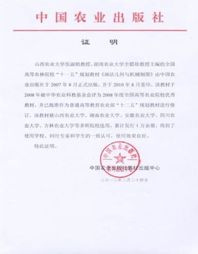 普通高等教育农业部“十一五”规划教材《画法几何与机械制图》获奖及发行证明